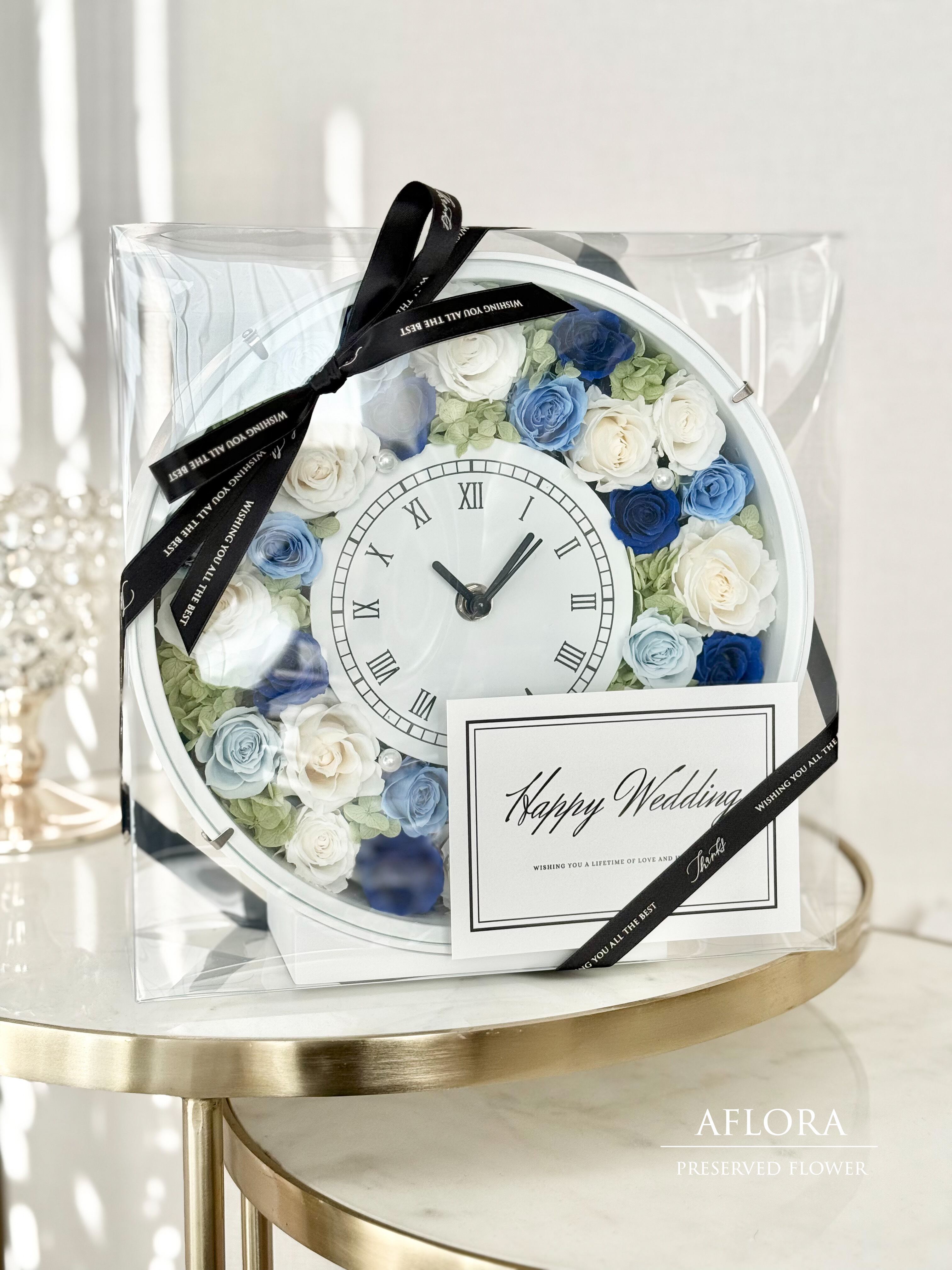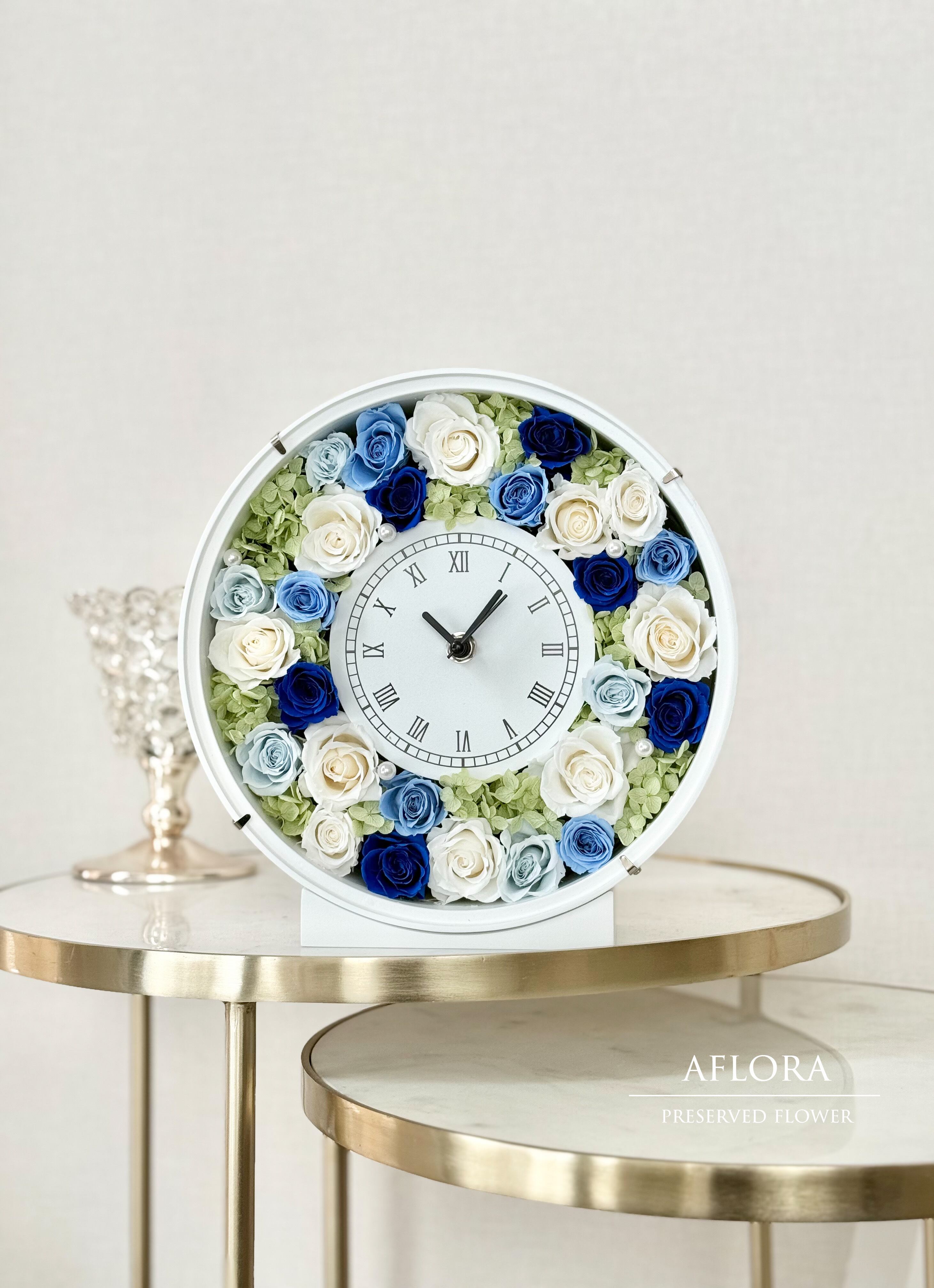 3色の青と白のローズ、アジサイのプリザーブドフラワーを使用した爽やかな雰囲気の花時計です。